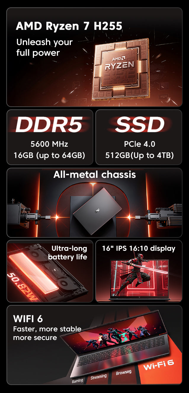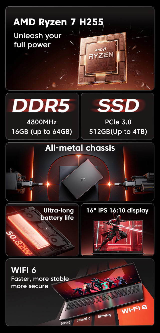 AMD Ryzen™ 7 H255 processor, 8 cores/16 threads, 3.8 GHz – 4.9 GHz, Zen 4 architecture, TSMC 4 nm FinFET process technology, 16 MB L3 cache, 45W TDP