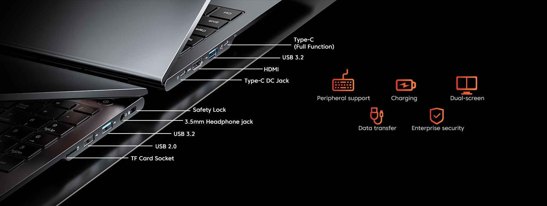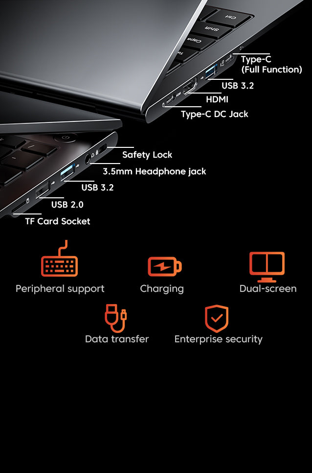 Type C full function*2 (DP1.4, 8K@60Hz, 20Gbps data transfer, PD charging)