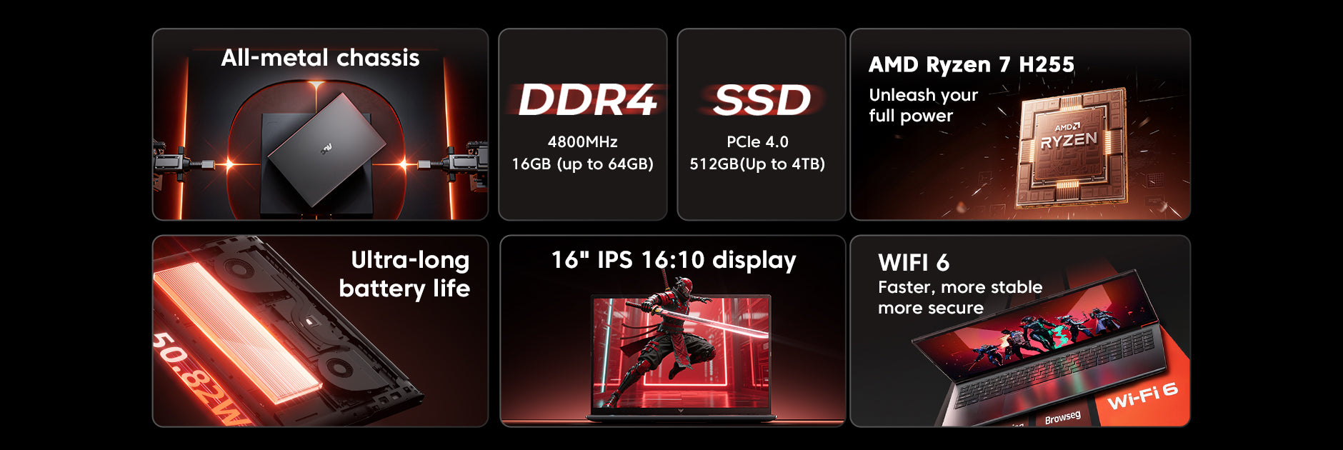 AMD Ryzen™ 7 H255 processor, 8 cores/16 threads, 3.8 GHz – 4.9 GHz, Zen 4 architecture, TSMC 4 nm FinFET process technology, 16 MB L3 cache, 45W TDP